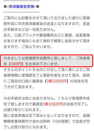 救済金の受け取りには「受領証作成」費用として3000円を支払って欲しいとのことです。