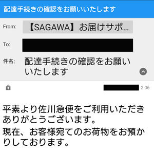 佐川からのメールのように見せていますが、こちらの名前も知らないようですし、私は佐川をほとんど利用したことがないのでメアドを知っているはずもありません。
