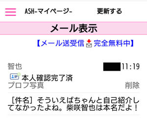 サイト名は「ASH/アッシュ」で、やはり当方を女性と認識してのメールの可能性が高いです。