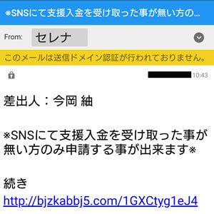 「SNSにて支援入金を受け取った事が無い方のみ申請することが出来ます」と書かれているので支援金詐欺サイトからのメールだということが分かります。
