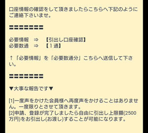 ある意味予想通りですが「引き出し口座確認」という確認メールを送ると2500万円を振り込むとのことです。