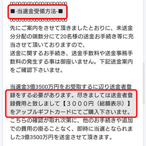 当選金の受け取り方法はというと送金者登録費用として3000円を支払って欲しいとのことでした。