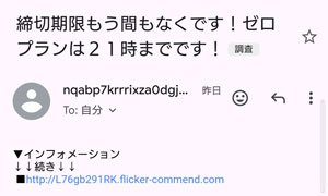 ゼロプランの締切期限が迫っているとのメッセージなので出会い系サイトの無料期間の延長ということでポイント購入を迫るようなメールだと考えられます。