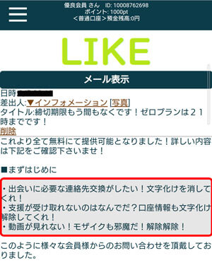 そういうことからこのサイトは支援詐欺に関しては口座情報は文字化けするということになりますし、エロ系のサクラに関しても連絡先交換が不可であるということになります。
