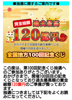 総額120億円で1等10億円、2等8億円、3等3億円が当たるそうです。