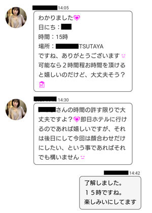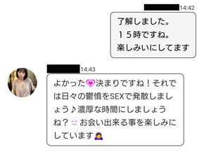 連絡先や服装などの目印を聞いてくるものと思ったのですが楽しくセックスを楽しみましょうとのメッセージでした(笑