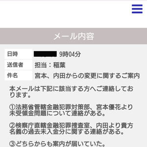② 検察庁直轄金融犯罪捜査室、内田より貴方名義の過去未入金分に関する連絡がある。