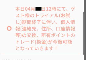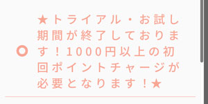 トライアル期間終了にともないポイントチャージが必要になるとのことで1000円以上のポイント購入を求められました。