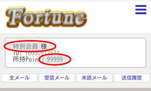 マイページはこのようになっており、私の登録名は「特別会員」で所持ポイントが「99999pt」あります。
