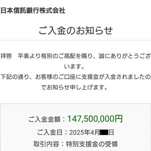 口座登録の方も完了できたので、147,500,000円の振り込みとなります。