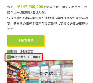行政機関への振込申請書の事務手続きの手数料として3000円を負担して欲しいとのことです。