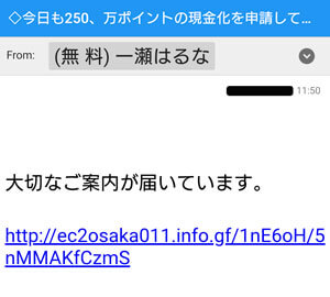件名に「今日も250万ポイントの現金化を申請して」と書かれていることからもポイント換金詐欺のサイトであることが疑われます。