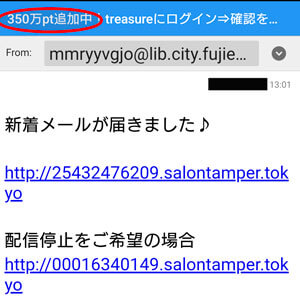 「350万pt追加中!」とのことなのでポイント換金詐欺が疑われる内容のメールです。