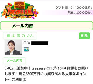 メールの内容はというと350万ptを追加したとのことで、たしかに現在ptが3500000ptもありその分のポイントが追加されています。