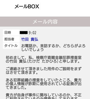 サイト名は見当たりませんが、検察庁の金融犯罪捜査の関係者を名乗る人物から私の個人情報が詐欺に利用されているとのことで確かめたいとのことです。